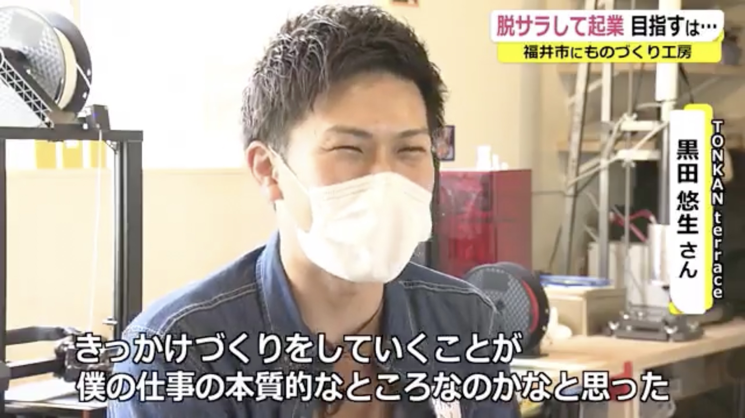 10年ほど会社員を経たのち、脱サラ起業でものづくり工房「トンカンテラス」をオープンさせた代表の黒田。という内容で、