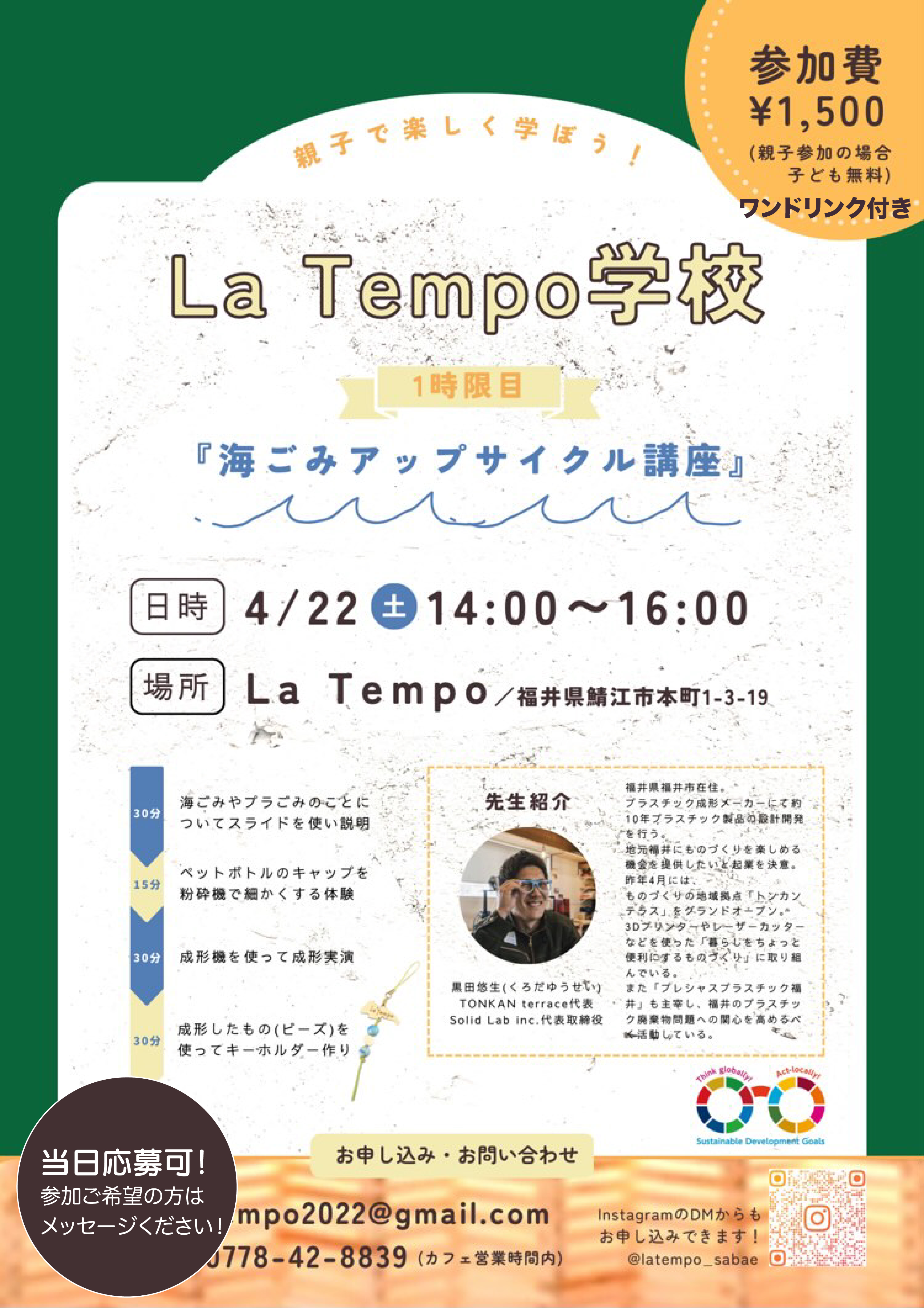 今週末は、トンカンテラス金曜は営業しておりますが、土曜日はお休みさせていただき、鯖江にあるカフェ&ホステルの「La tempo」さんにて海ごみアップサイクル出張講座へ行ってまいります!