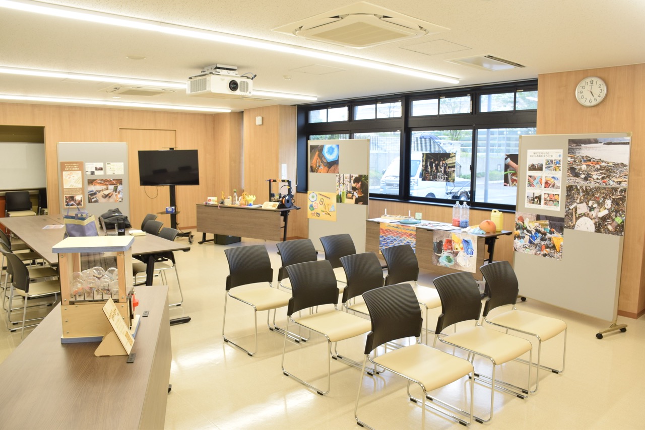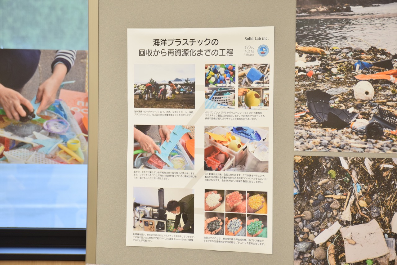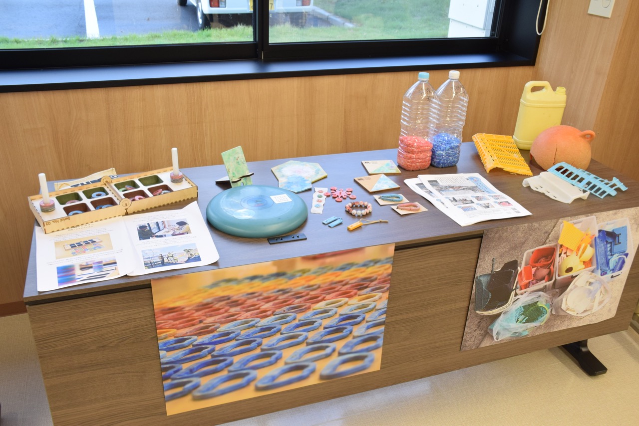 海ごみ問題を知ってもらう為の取り組みとして、ビーチクリーンや、資源化、アップサイクルなどの様子の写真展示の他、実際の海ごみやプロダクトなどを展示しております。