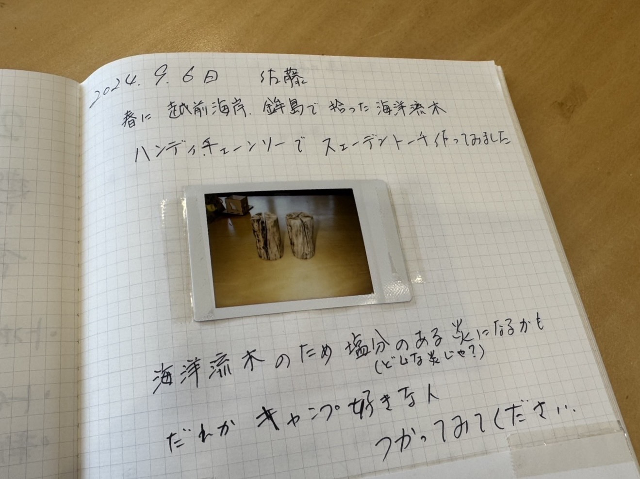 このノートには、トンカンテラスを利用してくれた方や、ふらっと立ち寄ってくれた方が、自由にものづくりの記録を残してくれています。