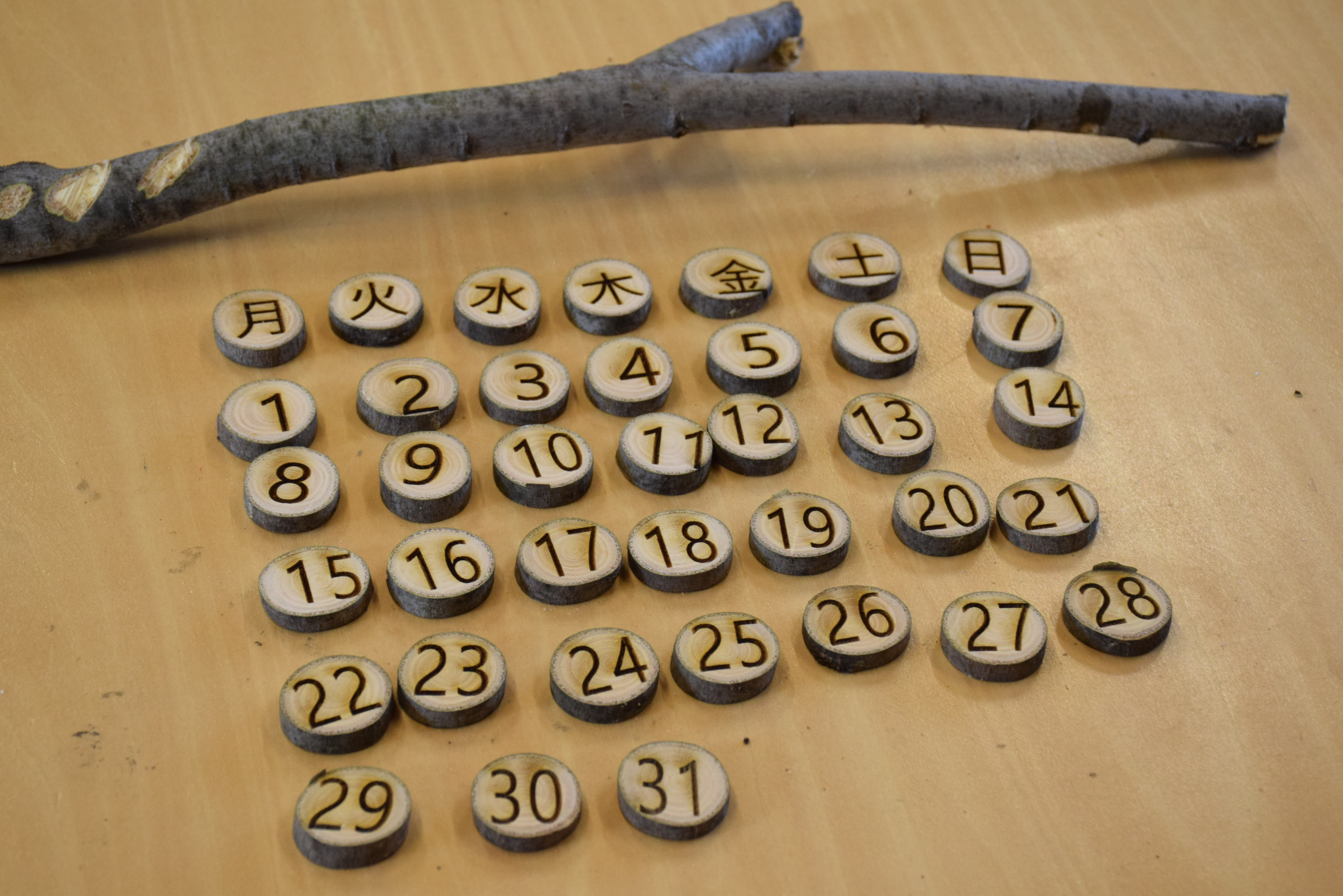 曜日から日数の刻印を、次から次へと輪切りの木を入れ替えながら行っていくこと約40個。