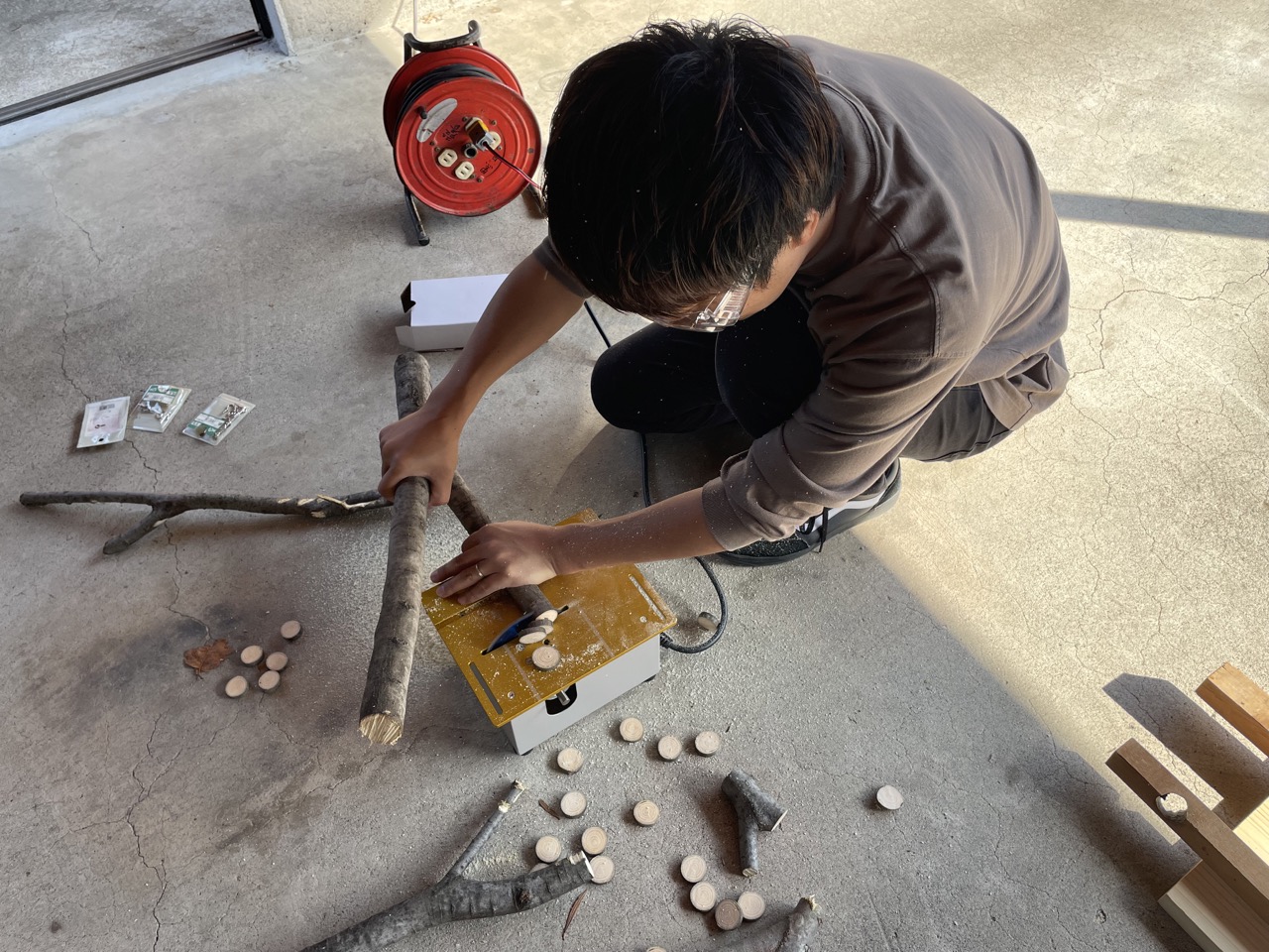 まずはケヤキの木を輪切りにしたいとのことでしたので、電動工具のテーブルソーを使って8mmくらいの厚みでカット。