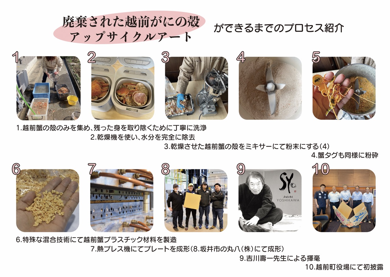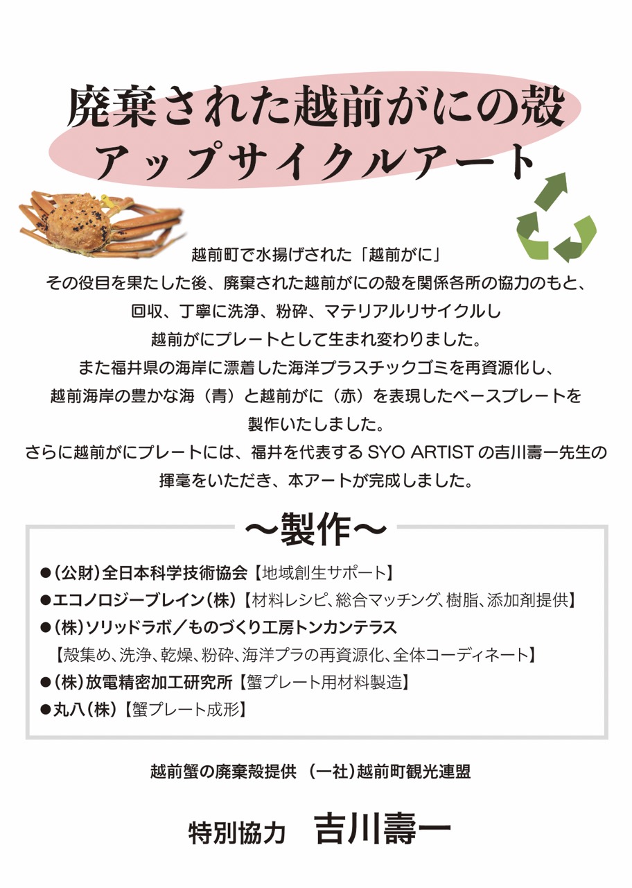 そんな越前がにの殻をプラスチックとして循環できるのかどうか。という実験検証を行うことを目的として、公益財団法人全日本科学技術協会様、エコノロジーブレイン株式会社様、放電精密加工研究所様、株式会社丸八様、SYOINGアーティスト吉川壽一様の協力のもとで、アート作品を制作し、越前町に位置する「越前がにミュージアム」に展示させて頂くことになりました。