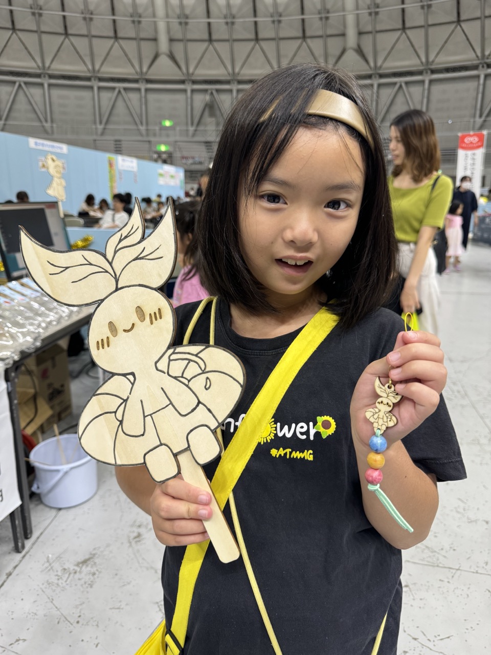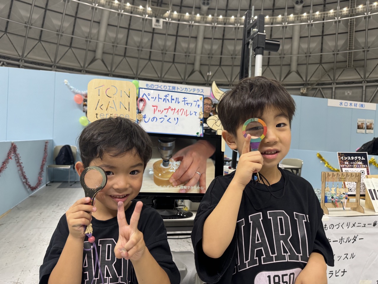 トンカンテラスブースでは、ペットボトルキャップをアップサイクルしたビーズを組み合わせて作るキーホルダーの他、
