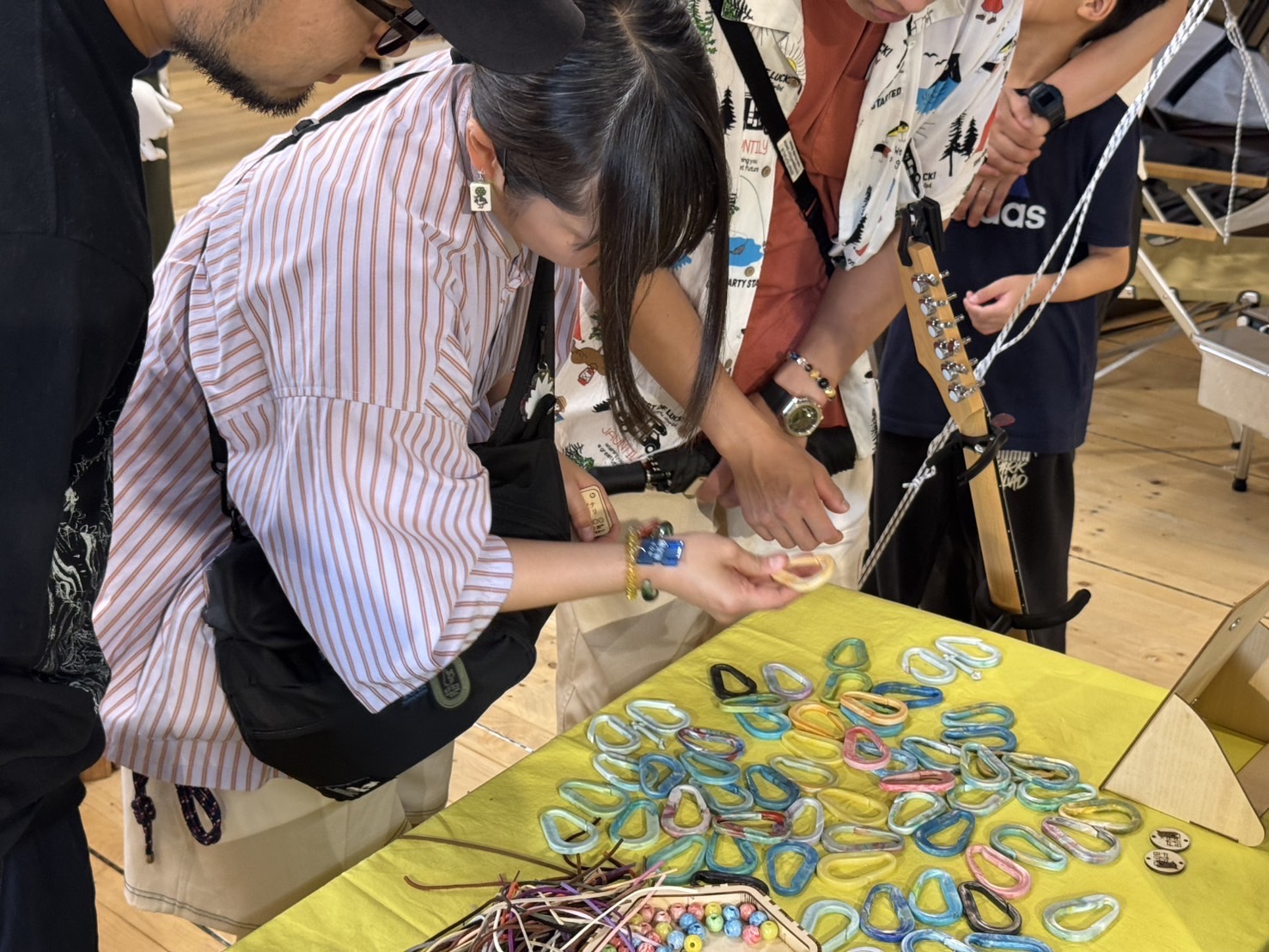昨年と違う点として、福井の繊維産業の廃材とのコラボということで、アパレルの業界から排出される廃材を使ったタッセルを作るワークショップと組み合わせてカラビナタッセルキーホルダーなども作れるようにいたしました。